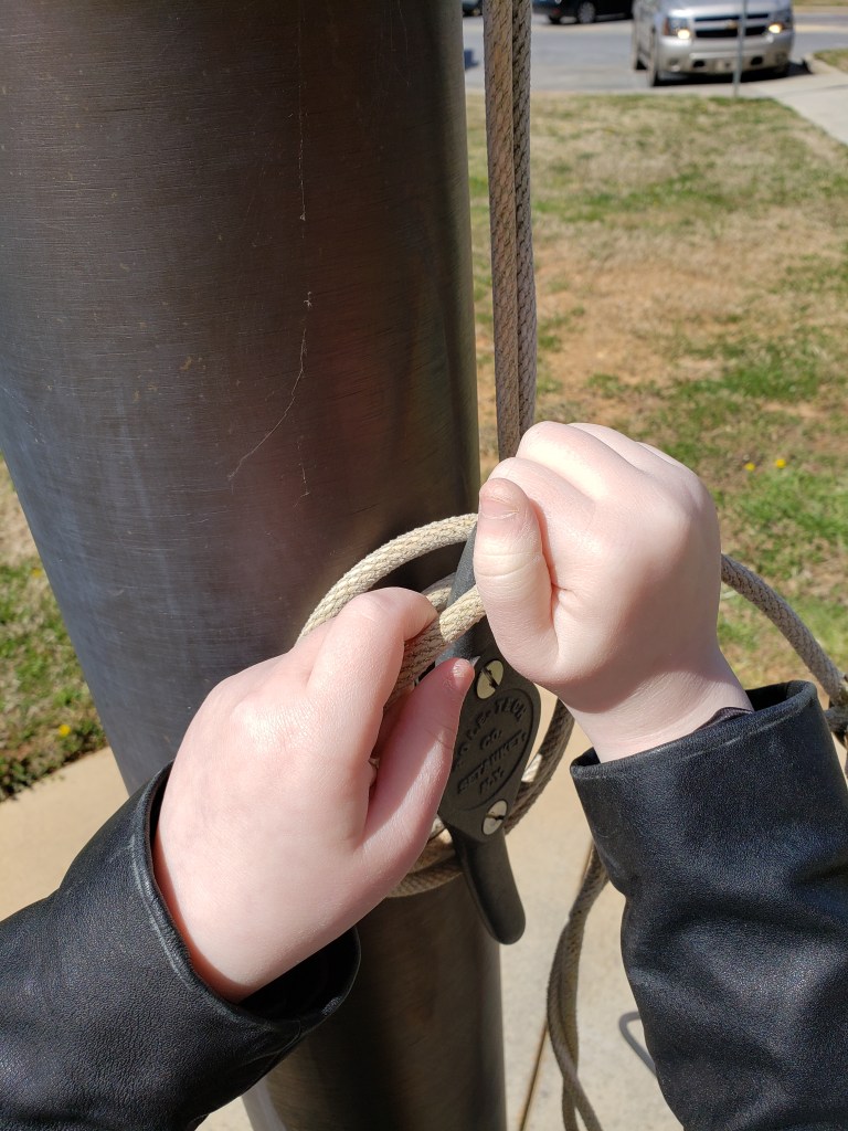 The flagpole on the school campus has special significance for my students. It is usually one of our first outside destinations because it is often located close to the front door of the school. The flag itself may be something that some blind or low vision students don’t actually have the chance to see or touch, unless an adult takes the time to provide that opportunity. They participate in classroom and school rituals surrounding the flag, but may not have ever had the chance to see it up close, with their eyes or …their hands.