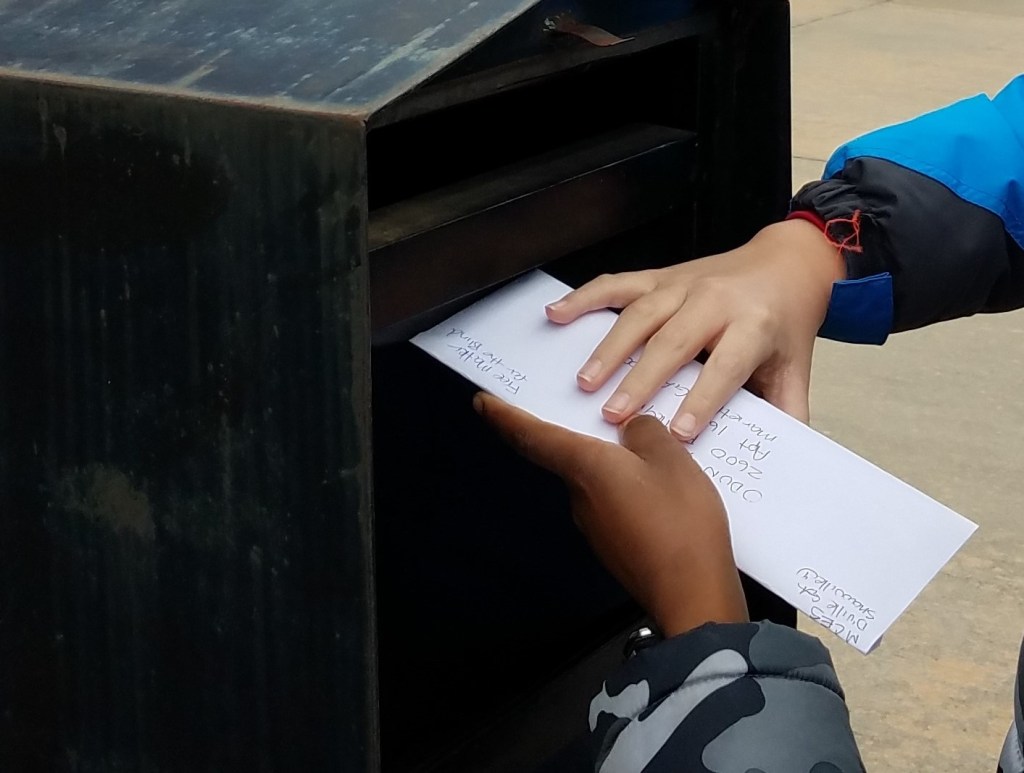 It was a chilly day for an Orientation & Mobility lesson and my students were not very happy about being outside. The wind was blowing, there was a chill in the air and as usual, they had been given a challenge to complete. Mobility lessons are a lot more fun when you can integrate the practice of cane skills into games and “missions to complete!” This week the boys had been given a letter, addressed to their teacher, who had just had a baby. They were to try to figure out how to get the letter to her. We talked about the envelop, the address, stamp and how it had been prepared for mailing. The question was… how do you mail a letter. They had decided to travel to the front office, deducing correctly… that the front office ladies know everything. She grinned at their questions and quite appropriately challenged them to go out the back door (the secret pasaage through the office!) and go find the mailbox. Now, neither of these two kids had ever “seen” a mailbox. They had heard about them, but really had no idea what they were looking for. Out the door and along the sidewalk they tapped with their canes until they got to the curb. As a helpful instructor, I explained that the Mail Carrier arrived in a small truck, pulled up the curb and took the mail out of the mailbox. They used a nice clearing technique and searched left and then right. Their canes hit a post and went thunk. Hands shot out and began to look for the “box.” It was great to listen to them brainstorm about where the box might be and how it was made. They talked about the height, what it was made of and how it was attached to the post. But, they couldn’t quite figure out how it worked! Finally, one of them found the slot in the front. When asked what it was he said, “its the door to the upsidedown!” No, not quite.. but it was the letter slot. They took time to ask questions to understand where the letter went once it was pushed into the slot, and how the mail carrier would open the box and get the mail. We learned a lot about mail and mailboxes that day! This photo shows the two boys working together to get the letter correctly placed into the slot and mailed off to their teacher!